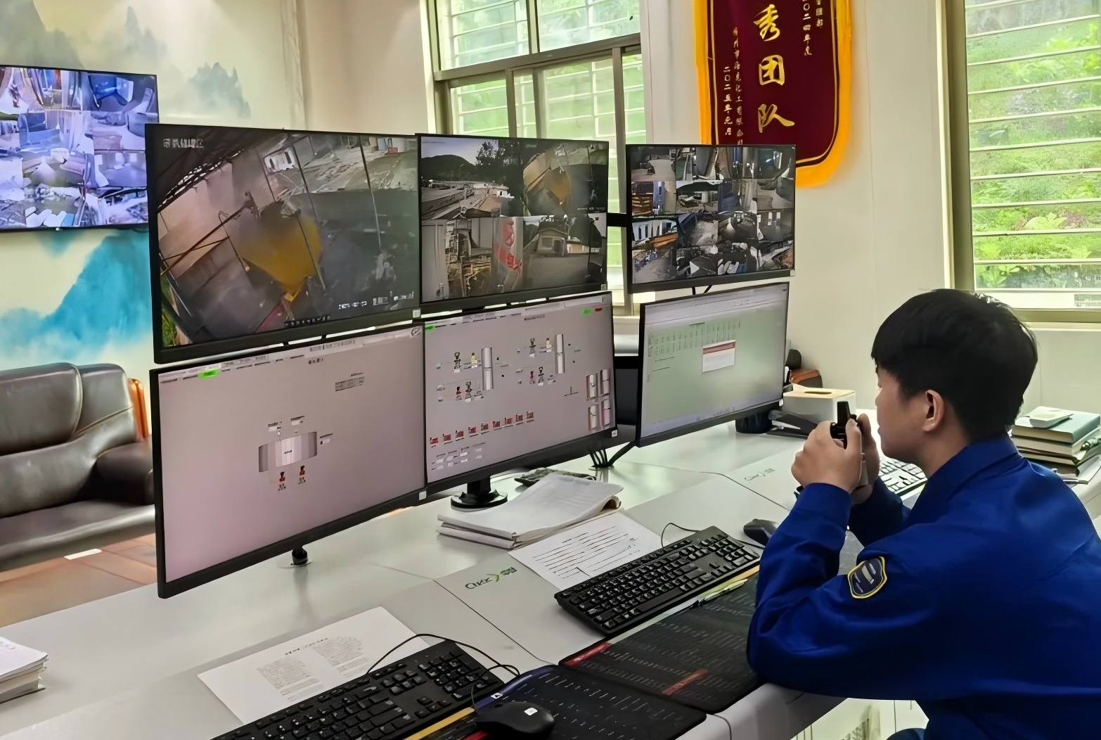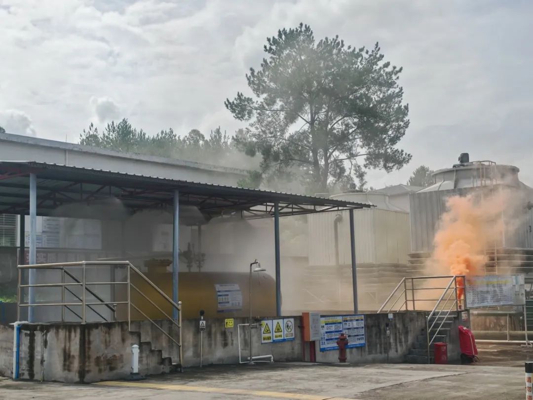 本次演練模擬化工廠液氨儲(chǔ)罐出料管道破裂,導(dǎo)致大量液氨發(fā)生泄漏并引發(fā)火災(zāi)。上午9時(shí)30分,中控室操作員在值班室突然聽到氣體報(bào)警器發(fā)生報(bào)警聲,立即查看視頻監(jiān)控,發(fā)現(xiàn)液氨儲(chǔ)罐出料管道冒出大量白煙,且觸發(fā)連鎖噴淋裝置,意識(shí)到液氨發(fā)生泄漏。情況非常緊急,該操作員立即上報(bào)公司應(yīng)急總指揮。